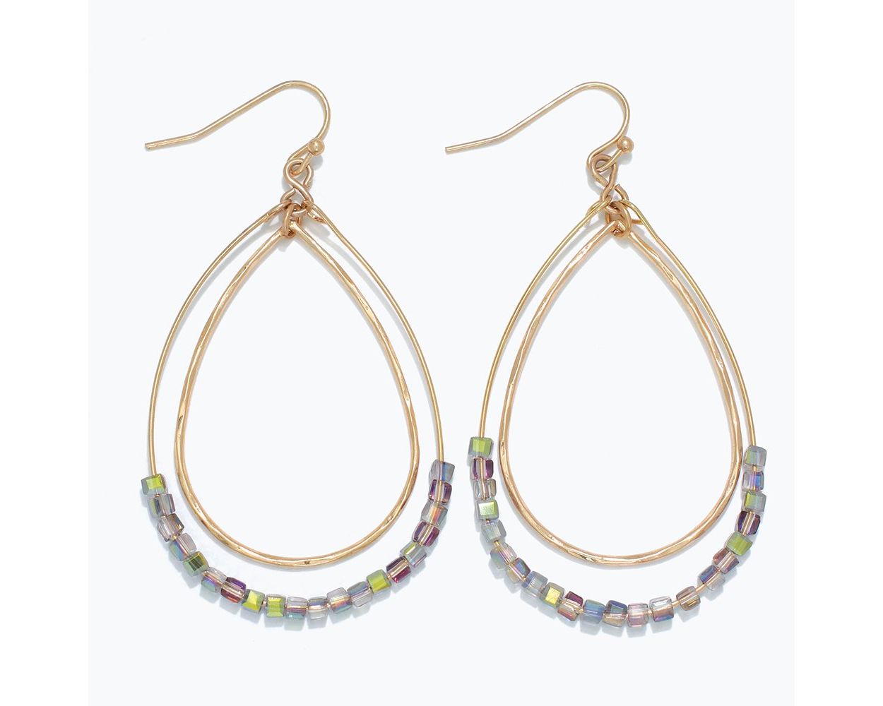 Double layer gold tone teardrops with faceted gold and smoky green crystals. Dangle approximately 2″ in length.