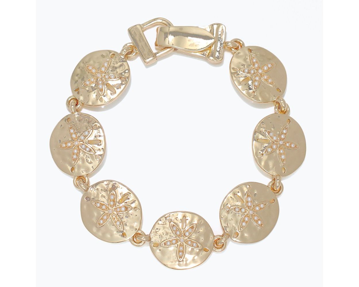 Gold Hammered Sand Dollar with Pearls Bracelet with magnetic clasp closure.
